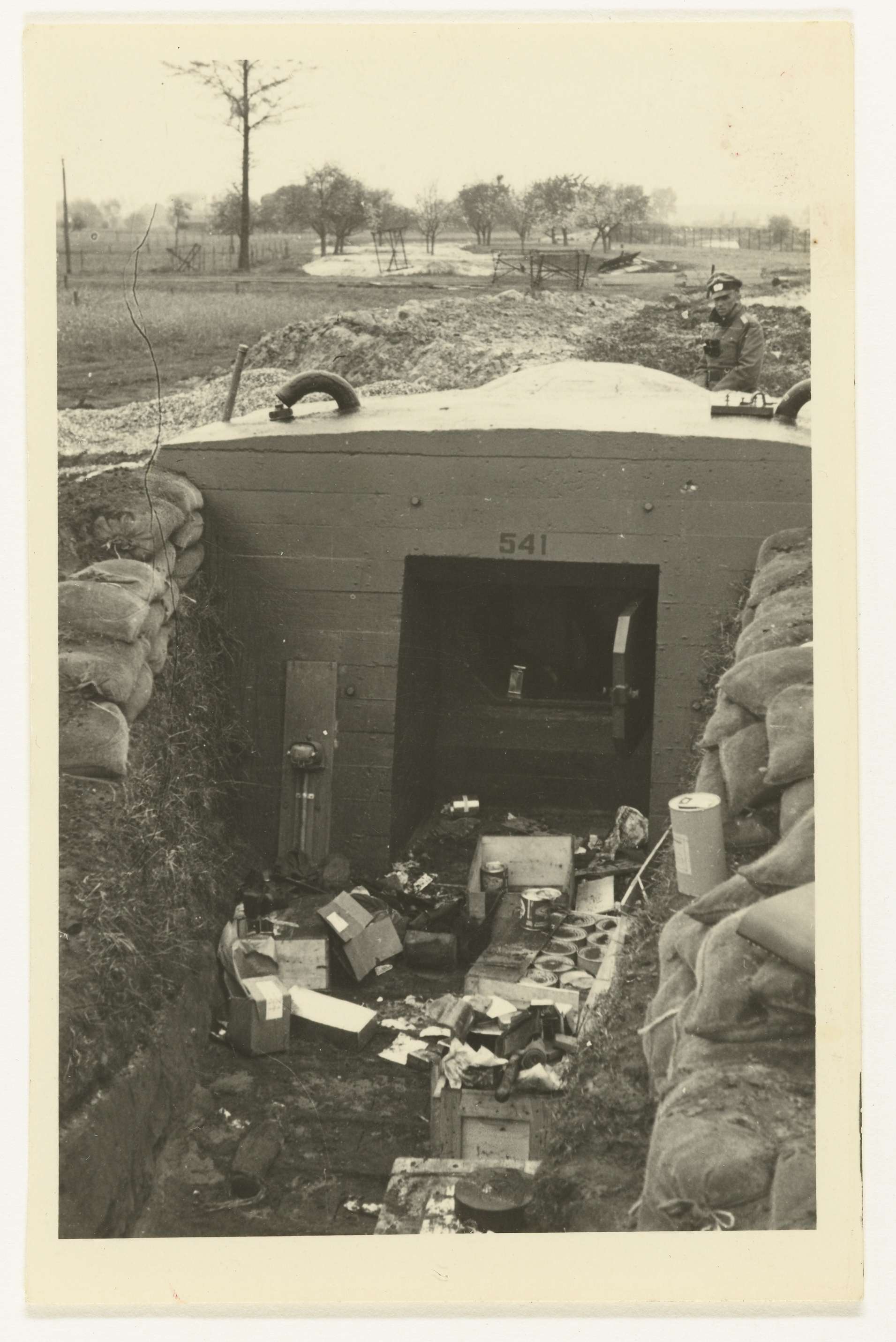 Verlaten Nederlandse bunker. Vooraan zandzakken en allerlei troep. Vlak erachter staat een Duitse militair met een verrekijker. Achterop staat: Verlassene Holl. Bunker.