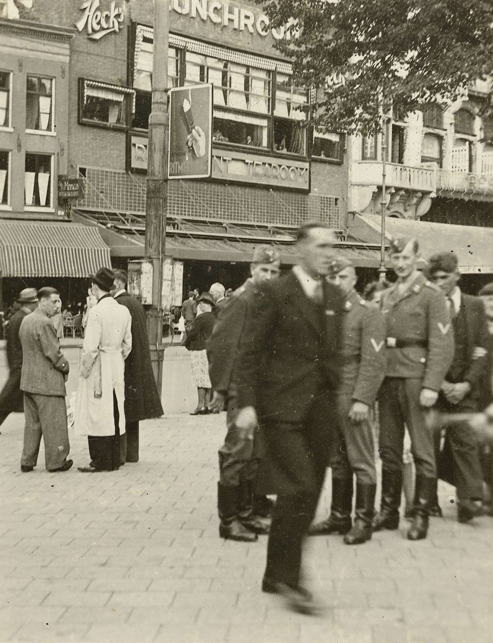Wehrmachtmilitairen staan op het Rembrandtplein, om hen heen burgers. Op de achtergrond is Heck's Lunchroom te zien. Geen opschrift achterop.