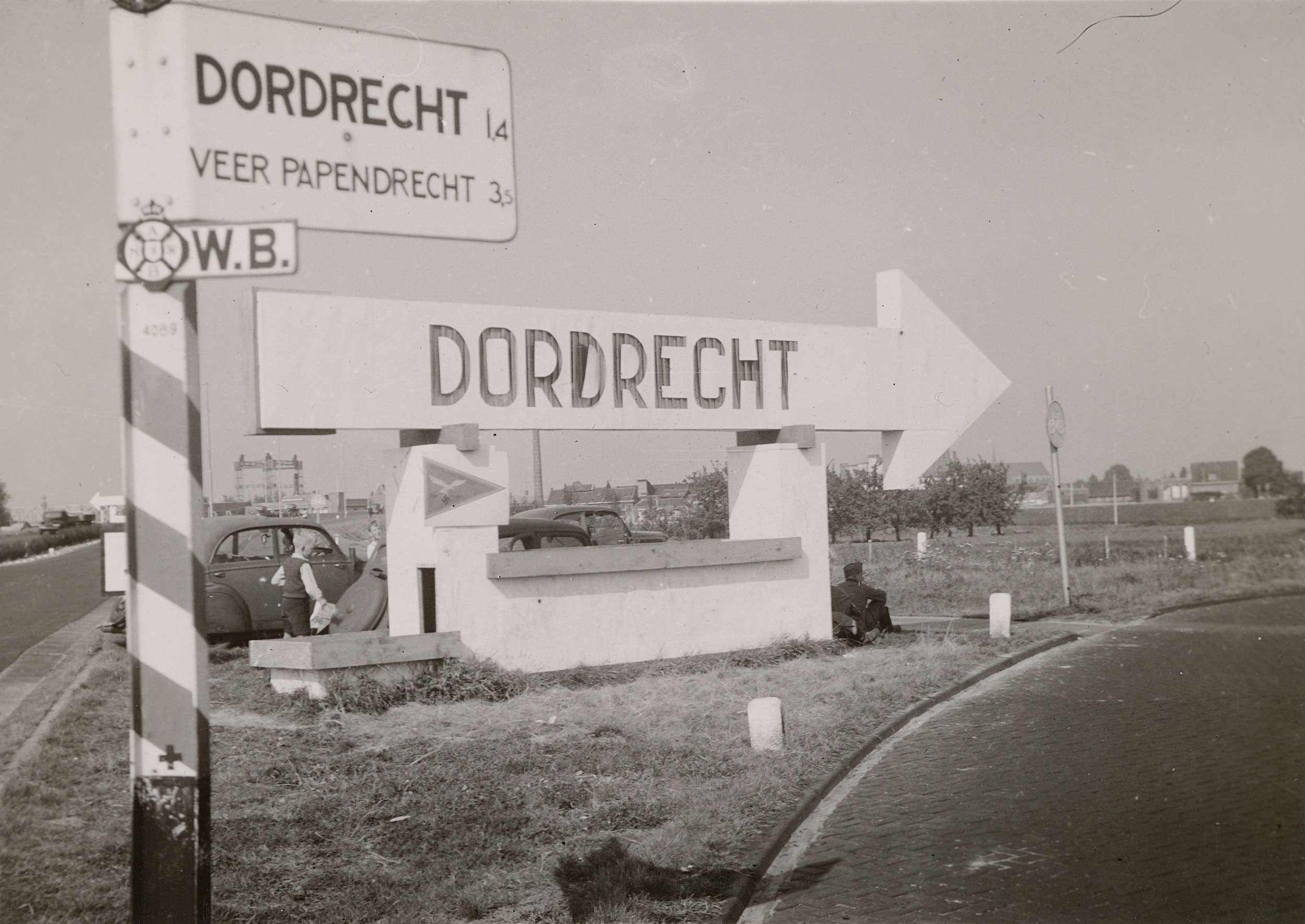 Langs een autoweg staat een ANWB bord richting Dordrecht. Daarnaast een constructie van steen met een pijl die het opschrift bevat: Dordrecht. Eronder een driehoek met vliegende vogel. Verwijzing naar Luftwaffe basis? Tegen de constructie leunt een Duitse militair. Erachter staan twee auto's met een blond jongetje.