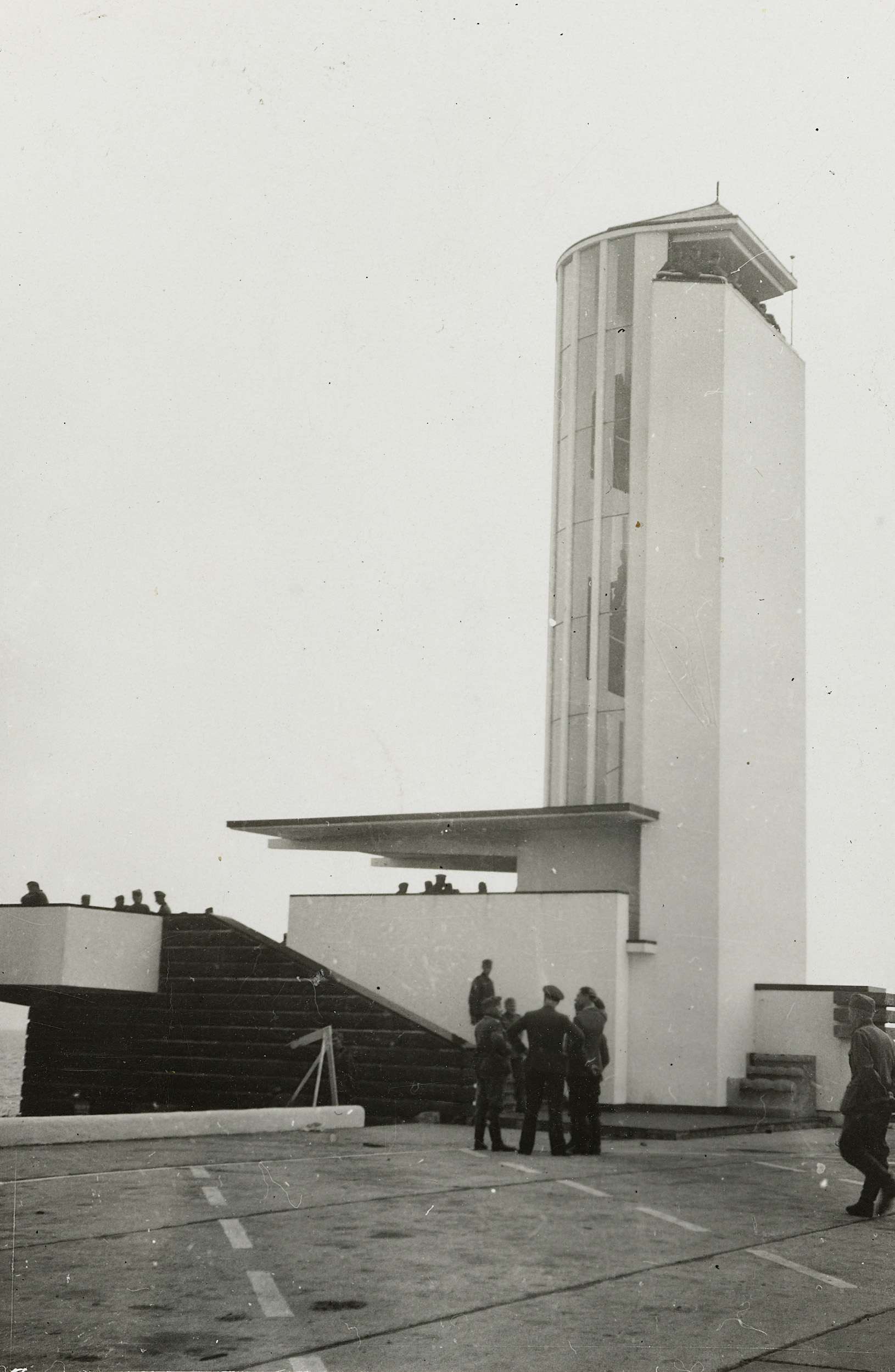 Duitse militairen staan bij het monument op de Afsluitdijk. Het monument, ontworpen door Dudok, is gebouwd op de plaats waar de Afsluitdijk gedicht werd in 1932. Achterop staat: Holland. Am See, Vünfter Treppe bin ich 60 m. über wasser.