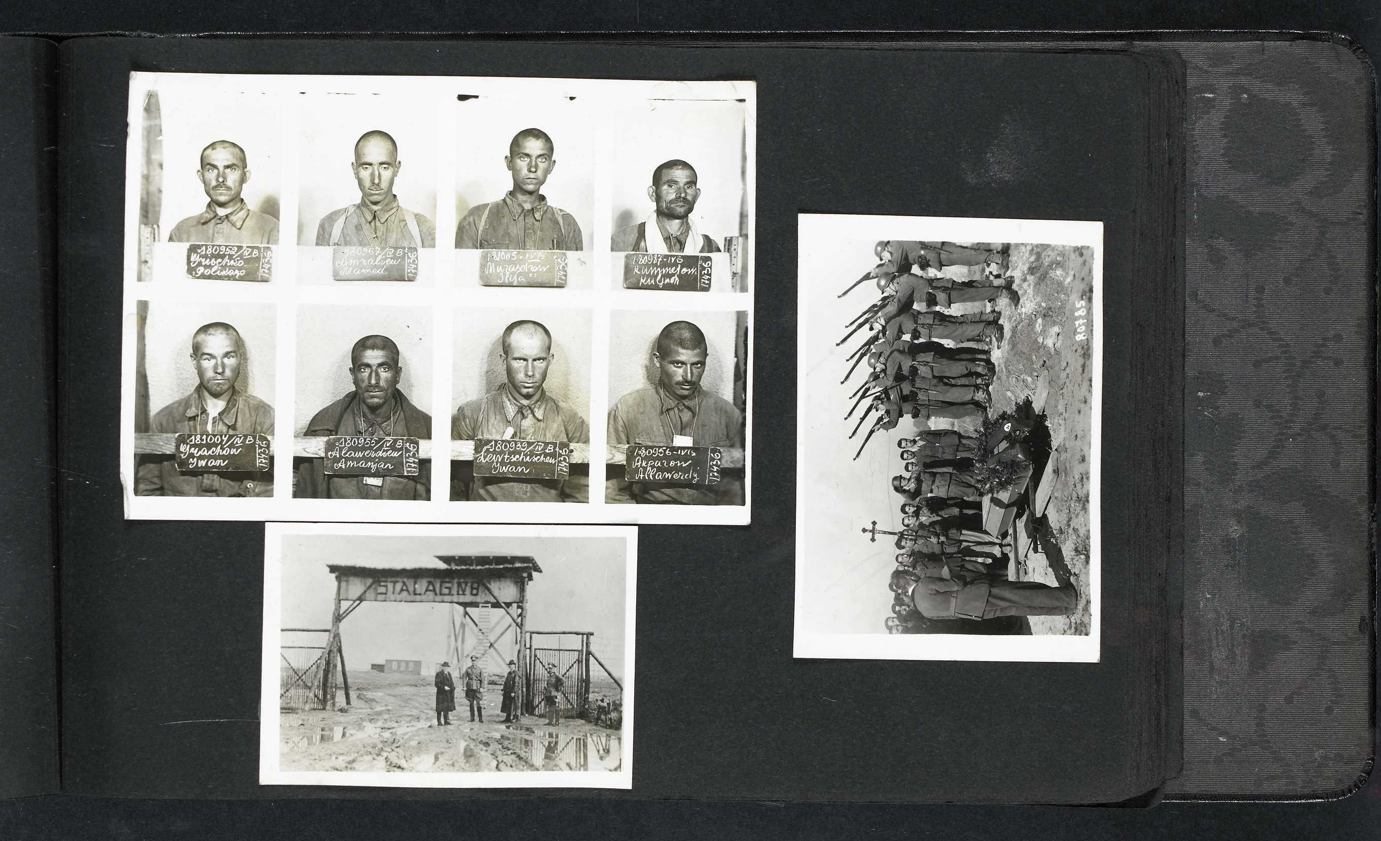 Albumblad met drie foto's: acht Russische krijgsgevangenen met bord waarop naam en nummer, een oude foto van de ingang van het kamp tijdens de bouw en een begrafenis van een gevangene. Onderdeel van een fotoalbum met foto's door Dick van Maarseveen van het krijgsgevangenenkamp Stalag IV B in Mühlberg in de periode 1943-1945.