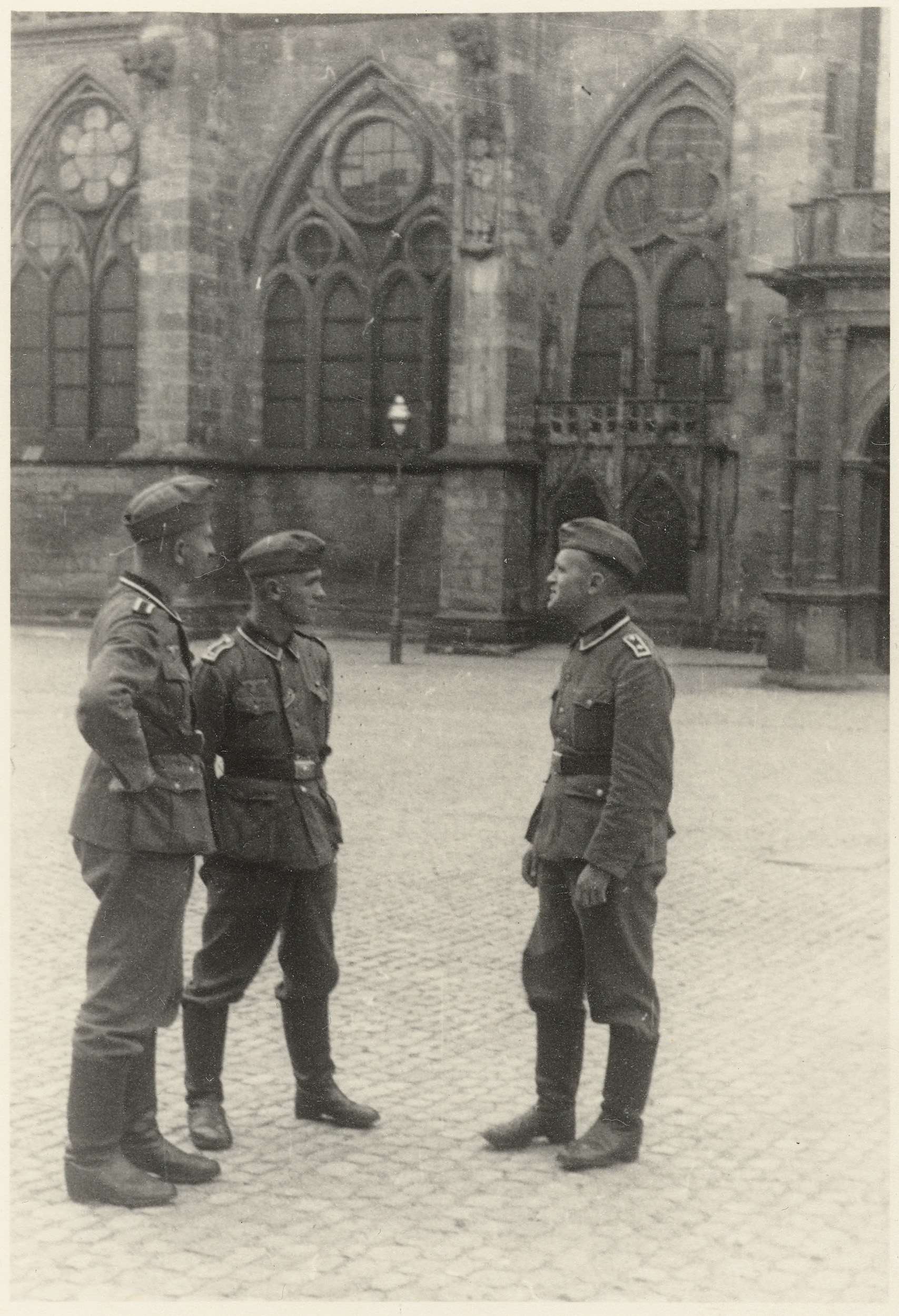 Drie Duitse soldaten staande voor een kerk. Foto behorend bij album 'Kriegserinnerungen'.