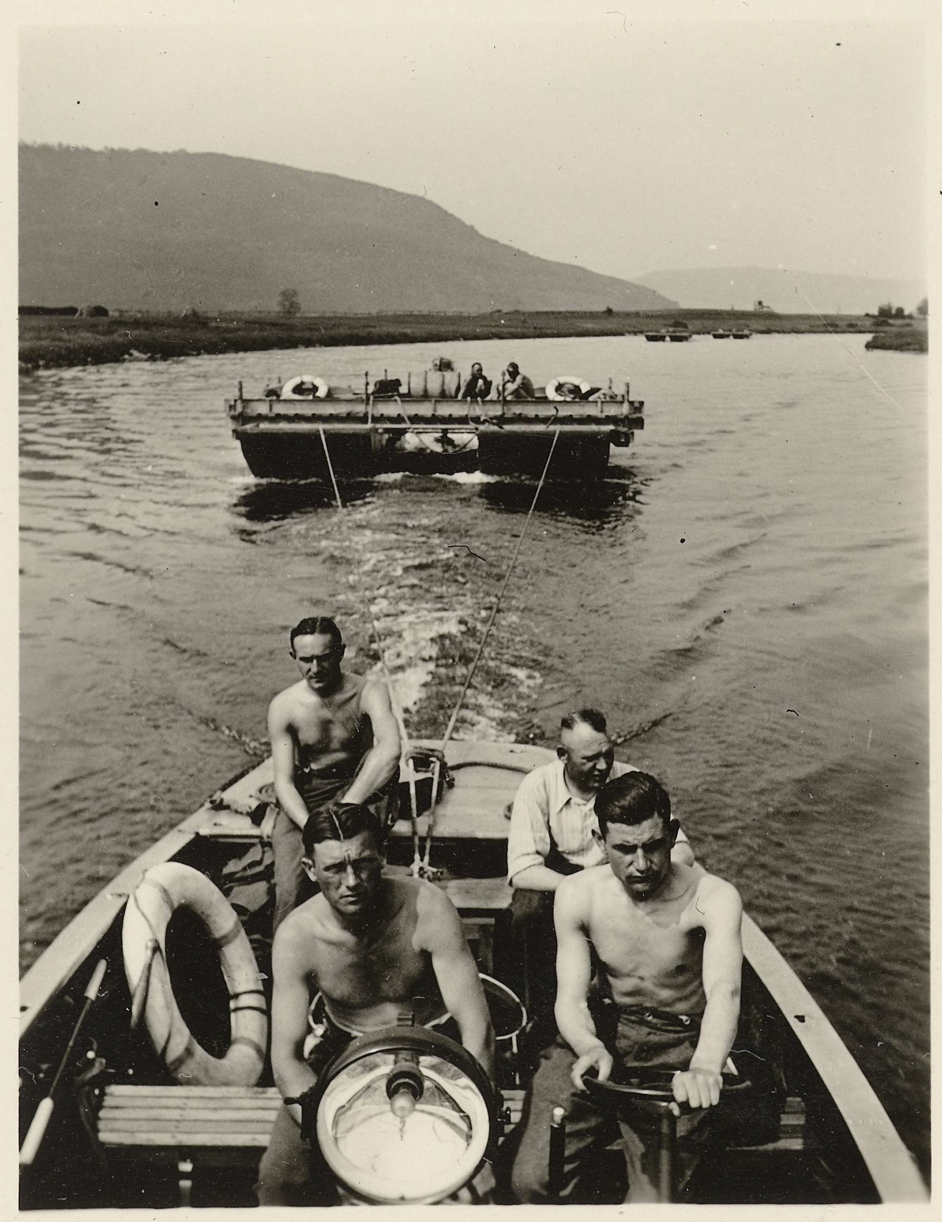 Vier mannen in een boot. De boot trekt een ander soort boot. Op de achterzijde staat: Wasserausg. in Hx. Foto behorend bij album 'Kriegserinnerungen'.