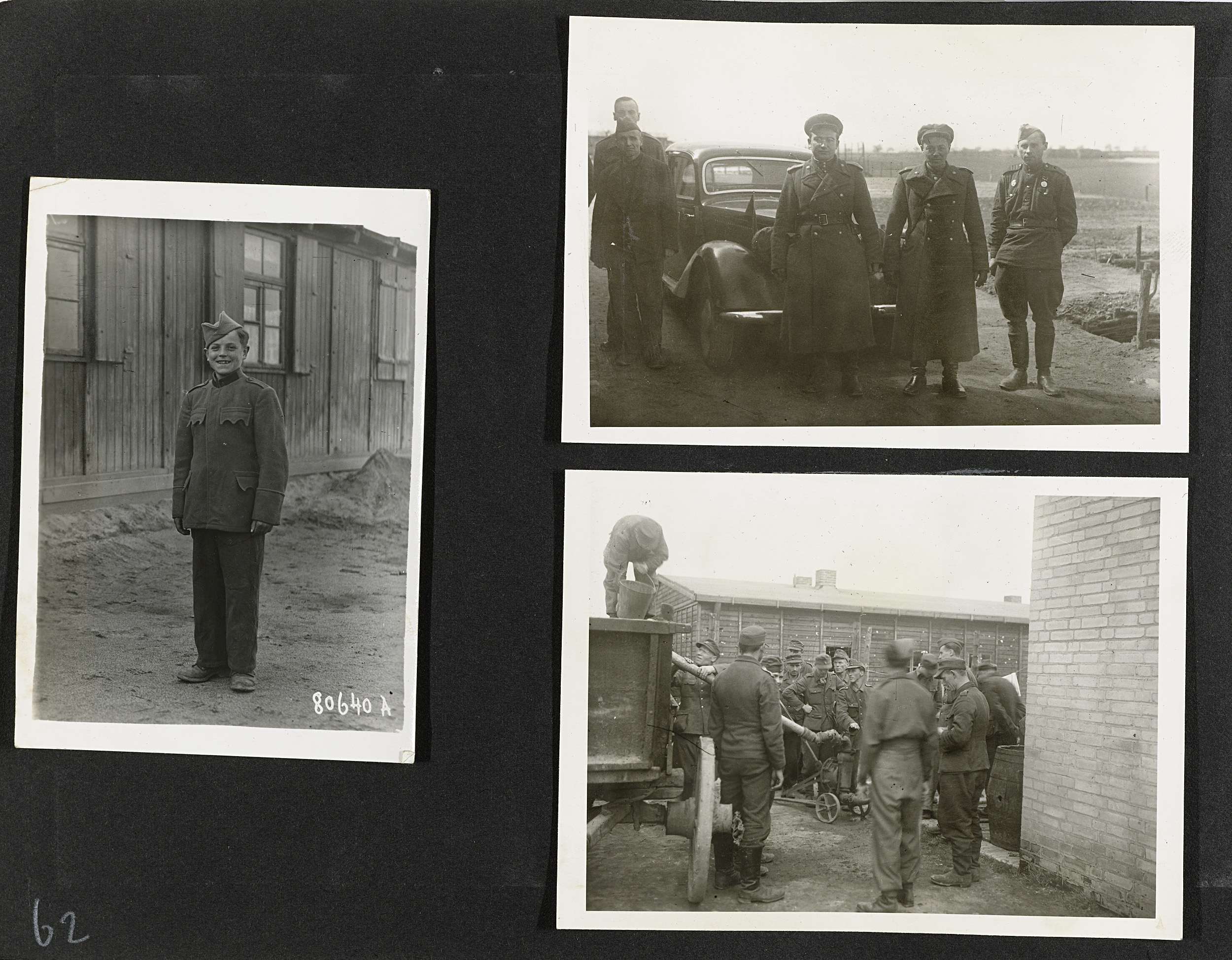 Albumblad met drie foto's: een jonge lachende krijgsgevangene, een groep Russen bij een auto en het leegpompen van een put. Onderdeel van een fotoalbum met foto's door Dick van Maarseveen van het krijgsgevangenenkamp Stalag IV B in Mühlberg in de periode 1943-1945.