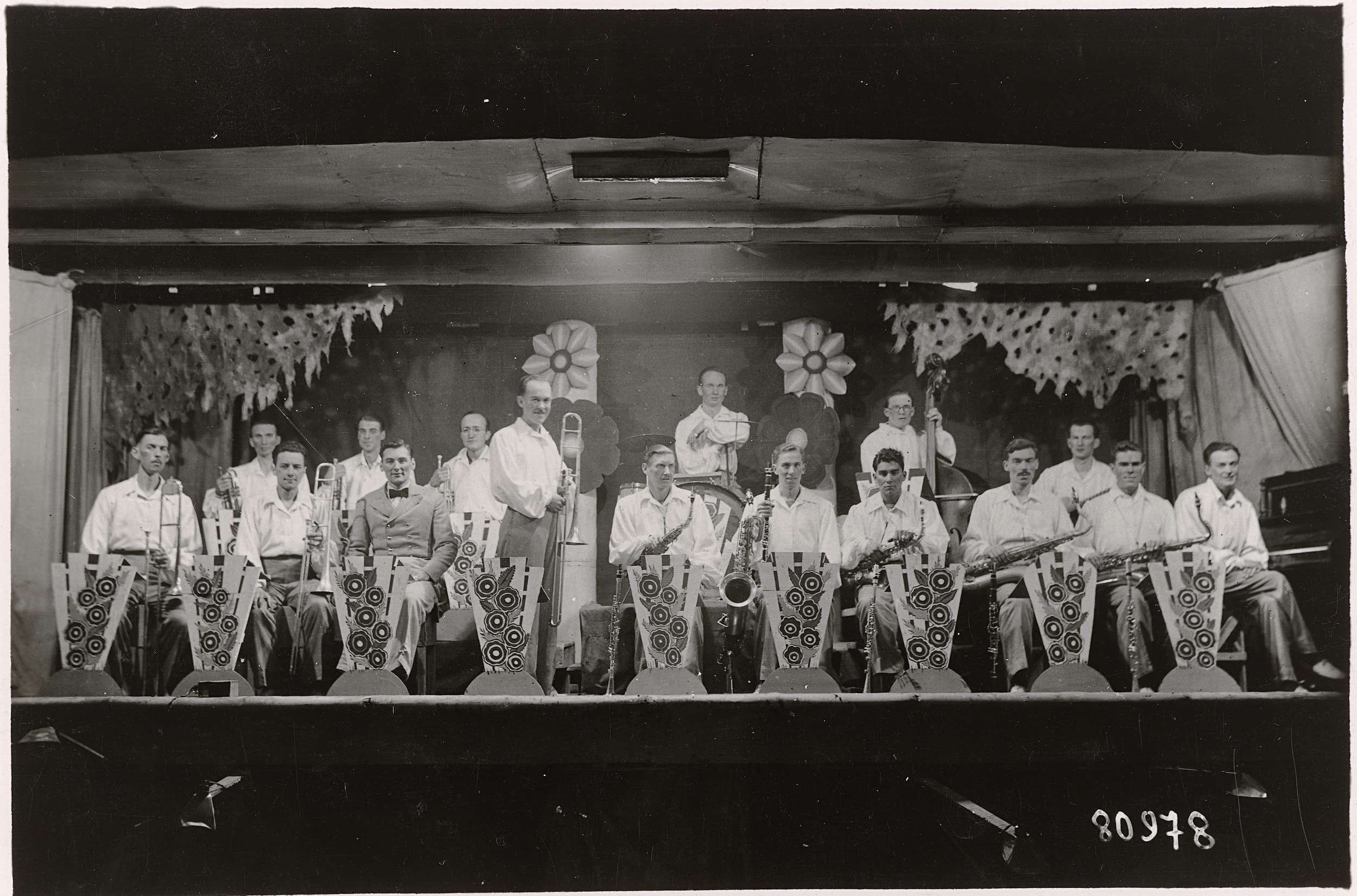 Bigband bestaande uit krijgsgevangenen in Kamp Mühlberg. Onderdeel van een groep foto's gemaakt door Dick van Maarseveen in het Duitse krijgsgevangenenkamp Stalag IV B in Mühlberg in de periode 1943-1945.