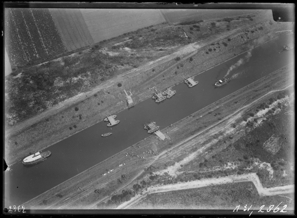 Luchtfoto van het Markkanaal ten zuiden van de voormalige Linie van de Munnikenhof. Een regiment Huzaren steekt via een door Pontonniers aangelegde pontonbrug (schipbrug) het Markkanaal over.