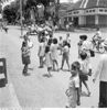 Een groep jonge schoolmeisjes loopt over de stoep van een drukke straat, Indonesië (1947)