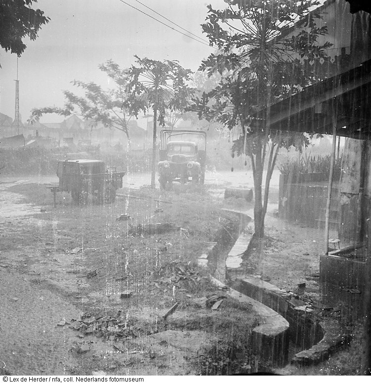 kampement in Balong Bendo Oost Java, (vernielde suikerfabriek) rode kruis auto, Indonesië, 1949