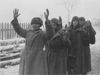 Vom Kampf um die Rollbahn Kiew - Schitomir. Sie können alles gebrauchen! Am Rande der Rollbahn steht ein Sowjetgeschütz, das durch einen Rohrkrepierer unbrachbar geworden ist. Zwei LKW - Fahrer schlagen die Schleppseile ab, denn sie können noch gute Dienste leisten.