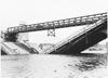 Wilhelminabrug Maastricht. De herstelwerkzaamheden aan de Wilhelminabrug te Maastricht, die op 10 mei 1940 door het Nederlandse leger werd vernield om het oprukkende Duitse leger te stuiten. Foto genomen naarhet noordwesten, waarschijnlijk vanaf de toren van de St.-Martinuskerk in Wyck (Rechtstraat). Links op de achtergrond het nog bestaande Eifelgebouw van de aardewerkfabriek Sphinx en een aantal bij de fabriek behorende schoorsteenpijpen. Uiterst rechts laagbouw, een gedeelte van de KNP (papierfabriek).