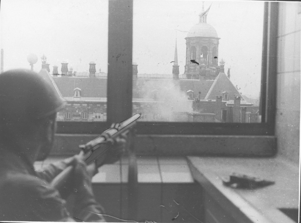 Het Dam-incident. Direct na het salvo uit de Groote Club over de Dam.
