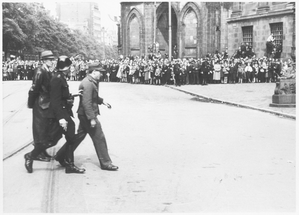 Het Dam-incident, Amsterdam. Rookwolk afkomstig van de uit het Paleis op de Groote Club afgevuurde Bazuka.