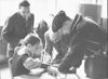Malnutrition in Holland: Special treatment for starvation victims. A doctor tests the bloodpressure of a Dutch boy in a Red Cross clinic at Amsterdam, where victims of the German starvation campaign are being treated.