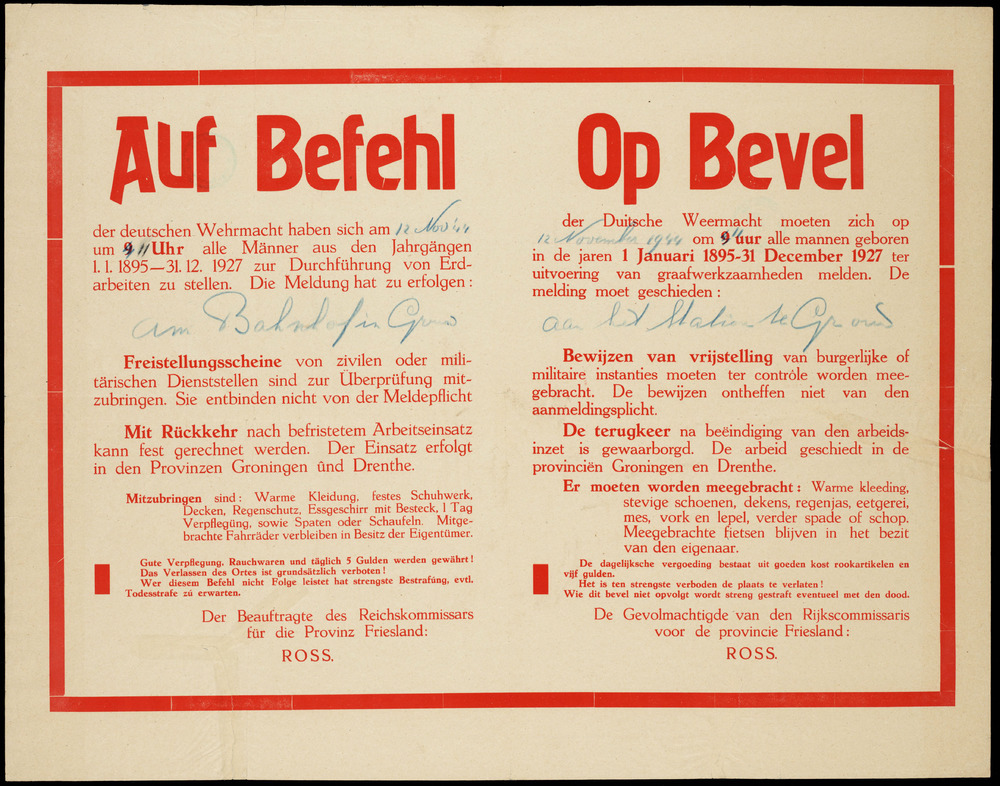 Op bevel van de duitse Weermacht moeten alle mannen in de leeftijd van 17 tot 50 jaar zich melden ter uitvoering van gra...