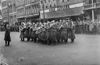 Publiek luistert naar een blaasorkest van de Wehrmacht op de Grote Markt in Groningen.