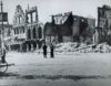Verwoeste panden en puinhopen op de Grote Markt. Twee mannen staan op de voorgrond.