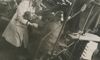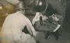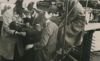 Oefening met gasmaskers, vermoedelijk in drukkerij J.B. Wolters. Slachtoffer wordt weggedragen.