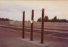 Een foto van drie palen naast elkaar, middelste met een briefje erop. Mogelijk was dit executieplaats.