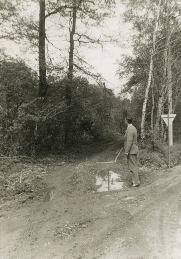 Een foto van een reüniereis van 19 personen aan kamp Peres. Een groep mensen loopt over het bospad met rechts in beeld een bordje aan de boom.