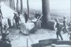 Een groep Duitse militairen is bezig om op een laan, met bomen buiten de stad een wegversperring te plaatsen.