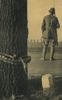 Prentbriefkaart uit de serie 'Nederland paraat serie 1'. Nederlandse soldaat op wacht bij brug waarvoor een asperge-versperring is aangebracht.