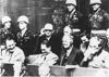 Het proces lacht ..... Vraag niet waarom ze lachen want dat zou ons te ver voeren daar het hun eigen wreedheden zijn waarvoor ze nu terecht staan. V.l.n.r.: Hermann Goering, Rudolf Hess, Joachim von Ribbentrop, veldmaarschalk Keitel; (tweede rij) Groot-admiraal Doenitz, Groot-admiraal Raeder en Baldur von Schirach. Vooraan links Rijksminister Seyss-Inquart, die in het vooruitzicht van zijn vonnis, blijkbaar geen lust gevoeld om aan de algemene vrolijkheid deel te nemen.