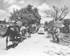 Allied soldiers watch defeated germans pass. An American soldier (left) and a Russian soldier stand on the roadside at right and watch the defeated German Army roll by in wagons near Freistadt, Austria, in the Third U.S. Army sector, after the war in Europe ended May 8, 1945, with the unconditional surrender of Germany.