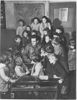 An American soldier finds new friends among French children. Wooden shoes and little coats are neatly lined up by their young amors in the cloak room of the small school in Magnieres, France. the overshoes of the visiting American soldier stand out prominently near the end of the line.