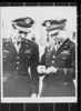 TOP-SCORING U.S. PILOTS. Twenty-two-year-old Capt. Duane W. Beeson, Boise, Idaho (right) and twenty-three-year-old Capt. Don S. Gentile, Piqua, Ohio, two top-scoring U.S. Mustang fighter pilots in England, examine the cluster to the D.F.C. which Gentile received from Brig. Gen. Jesse. W. Auton March 25, 1944. Gentile's score as of April 1, 1944 stood at 22 destroyed with Beeson's record of 21 running a close second.