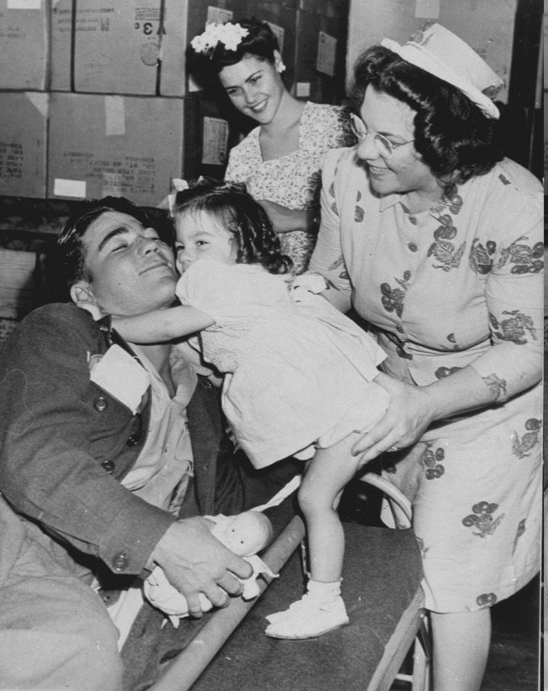 Wounded U.S. soldier greeted upon arrival in New York City from Europe. U.S. Private first class Lee Harper, who was wounded in the European theater of war, is greeted by his two-and-a-half-year-old sister, Janet, whom he had never seen before, on his arrival in New York City on Aug. 1, 1945. His mother, Mrs. Jessie Harper (right) and his wife, Elizabeth (rear) look on. Private Harper was the first soldier to leave the U.S. Army hospital plane which carried 20 wounded veterans from Europe. Although nearly 40,000 sick and wounded soldiers have been landed at New York's La Guardia Field since April, 1944, this was the first time relatives had been permitted to greet the men upon their arrival at the airport. Private Harper has been in the U.S. Army five years and went overseas two years ago with the Eighty-second Airborne Division. He was wounded in Normandy on June 30, 1944, and holds the Distinguished Service Cross.