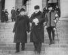La foule anxieuse attend la fin de lálerte, tandis quúne blésse reçoit les premiers soins.