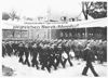 Heimkehr der Narvik Kämpfer. Die Besatzung eines im Kampf gegen die Engländer in Norwegen gesunkenen deutschen Zerstörers auf dem Dempfer, der sie in die Heimat zurückbrachte. Rettungsring, Schiffsglocke und Hoheitszeichen sind gerettet worden.