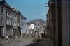 Enkele volledig verwoeste huizen in de rij, veel puin op straat. Een fietser laveert ertussendoor.