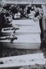 Foto van collectief graf met bloemenversiering. Tekst achterop; 'Bloemenhulde collectief graf crew 25/26-5-1943. 01.53 uur. Lancaster ED-660, SR- , 101 Sqn. bij Vught-Cromvoirt w/s IJzeren Man. Op 30-8-43 op last Ortskommandant herbegraven te Uden vanwege grote bloemenhulde te Vught. Foto: via Pastor Thuring via Eerw. Zuster Thuring klooster Vught. Tekst ernaast: 'Drie opnamen van gebrachte bloemenhulde op het collectiefgraf van de bemanning van lancaster ED-660 van het 101 Sqn. welke in de nacht van 25/26-5-1943 nabij Vuhgt-Cromvoirt door een nachtjager werd neergeschoten. Deze bloemenhulde was een doorn in het oog van de Duitse Orts-kommandant , die dan ook op 30-8-1943 opdracht gf de bemanning op de graven en her te begraven te Uden. Foto serie Zr. Eerw. Zr. Thuring via G. Thuring, Breedeweg Bezoeker meldt: DIscovered this picture of where my Great Uncle, Arthur S. Thomson, Mid-Upper Gunner, RCAF, on Lancaster ED660 was first buried after crashing on the night of May 25/26, 1943 after being shot down, along with 6 other crew members.'.