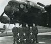 Groepsfoto van vijf jonge mannen in R.A.F. uniform voor neus van een Avro Lancaster, codeletter A, met neusbeschildering van figuur en tekst 'Nemo me impune lacessit' en negentien bomsymbolen. Cover over de neus.