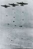 Foto van drie Junkers 52 transportvliegtuigen. Tekst: 'Een zeldzame foto-serie van het neerschieten vaneen JU-52 omstreeks 05.30 op 10-5-1940 boven den Haag door het 164e Bt. Lu.A. Het meest linkse (op de foto rechtse) vliegtuig krijgt een voltreffer in de benzine-tanks en stort neer in de Tweede Adelheidstraat.In he vliegtuig vinden 16 man de dood, t.w. 3 bemanningsleden en 13 man van de 22e Luftlande Division. In het wrak worden de volledige plannen van de Duitse luchtlanding gevonden'. Junkers 52.
