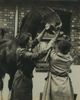 Foto van twee Britse vrouwen met een paard. Stallen op de achtergrond. Westelijk Front, Eerste Wereldoorlog. Tekst: 'Officieele Britsche foto. Het vrouwelke hulpcorps en haar werkkring. Het afvijlen der kiezen om het verteeren van het eten te bevorderen'. Stempel achterop: 'British Official Photograph Crown copyright reserved. Ministry of information, photographic section , 10, 11, 12 Coventry street, London W.1' en 'Passed for WW transmission abroad'.