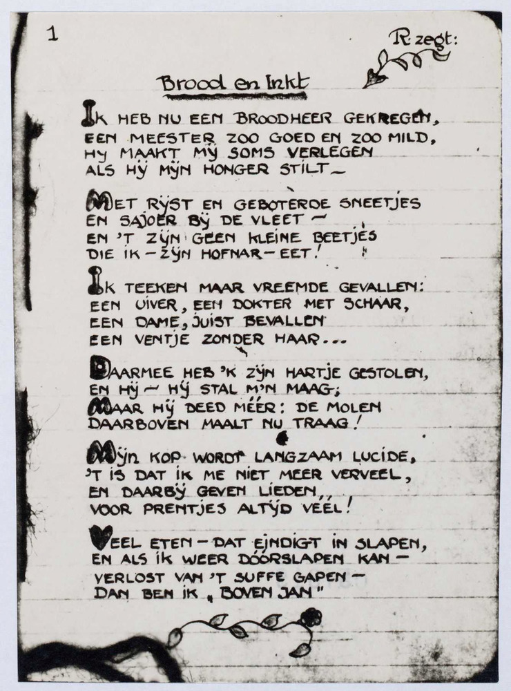 Pagina 10 van de gedichtenbundel; `Brood'. De tekenaar heeft een dochtertje Ria gekregen gedurende zijn verblijf in een Japans interneringskamp. Hij maakt tekeningen en gedichten voor dit kind, dat in een vrouwenkamp bij zijn vrouw verblijft.
