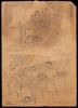 Twee tekeningen op een vel; onderdeel van een serie tekeningen van onder andere Bram Veugel, Appie Brauckman, P. van Bergen, G. Voorneman e.a. betreffende o.a. de Gevangenis Changi Jail te Singapore en de krijgsgevangenkampen te Nakhon Pathom en Chungkai te Thailand. `'Groep van 5''. Opdruk papier sigarettenpakje.