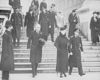 King Edward and Queen Mary at armstice service at Cenotaph. London: The King (in uniform) and Queen Mary leaving Clive Steps, Whitehall. Sir John Simon, Home Secretary, is carrying his hat. (left to right on steps) are the Duke and Duchess of York, the Duke of Kent, and the Duchess of Gloucester (in light coat).