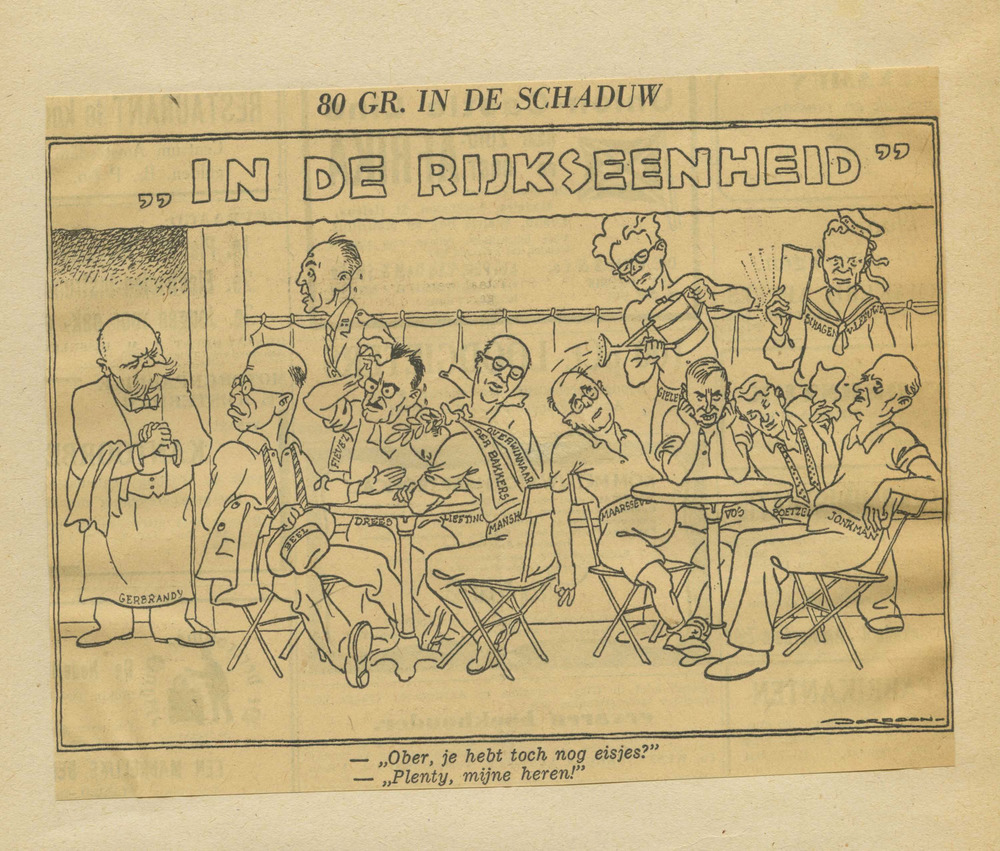 `80 gr. in de schaduw' Op het terras van café In de Rijkseenheid zit in de hitte de naoorlogse Nederlandse regering. Beel stelt aan ober Gerbrandy de vraag of er nog ijsjes zijn. Plenty, mijne heren!.