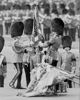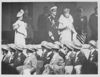 Huge Hyde Park National Service today. The Royal Party at the saluting base. Left to right: The Queen, the King, and Queen Mary, at the saluting base in Hyde Park (London) today during the march past of the thousands of National Service Volunteers.