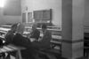 Collectie foto's (negatieven) afkomstig van de 'Filmdienst der Binnenlandsche Strijdkrachten Gewest 13, District Delft'. Betreft in hoofdzaak de periode kort voor, tijdens en direct na de bevrijding. Bespreking in een voedseluitdelingslokaal gevestigd, mogelijk in de Dr A. Kuyperschool in de Huyterstraat, Delft. De man met de baard (geheel links) is de leider van de Landelijke Filmdienst der BS.