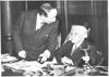 Transmission des pouvoirs au Ministère des Affaires Etrangères. Pendant la transmission des pouvoirs M. Delbos, ancien Ministre qui vient de recevoir une communication téléphonique, met M. Paul Boncour, nouveau Ministre des Affaires Etrangères au courant de celle-ci.