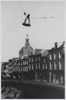 Klokkenroof Leiden. Een klok van de Hartebrugkerk wordt uit de toren getakeld. Op de achtergrond de nog niet gedempte Lange Mare en de Marekerk. De Mare is hier nog niet gedempt. Dat gebeurde in twee gedeelten in 1953 en 1960.