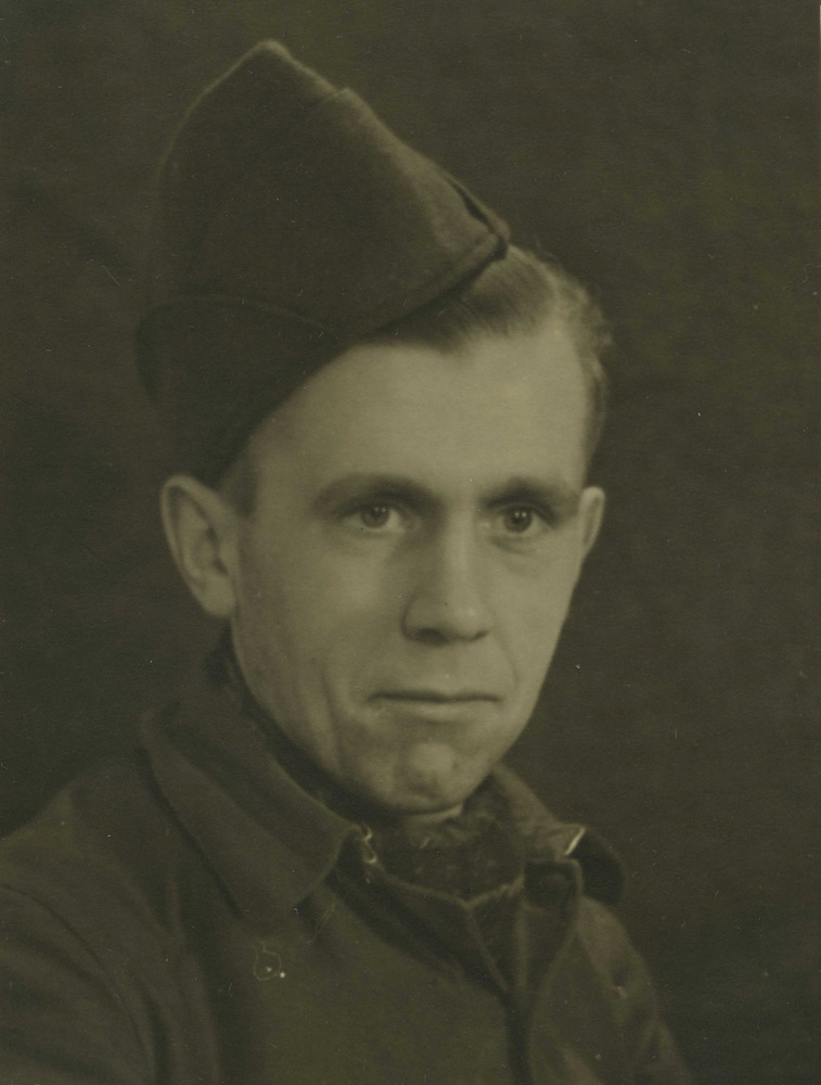 Portretten Regiment Jagers, 1939-1940. Twee militairen poseren voor een vrachtwagen. De linker militair draagt het model manschappen uniform en de kraagemblemen van het Regiment Jagers. Beiden dragen beenkappen voor chauffeursdienst. De rechter militair draagt het leren jekker voor chauffeurs en motorrijders. Ook hij draagt op de kwartiermuts het embleem van het Regiment Jagers. Een van de twee is dienstplichtig soldaat J. Veltkamp. De melkbus op de voorgrond is voorzien van een kraan ten behoeve van drinkwater. De afgebeelde vrachtwagen is van het Amerikaanse merk FARGO, hetgeen met enige moeite op de wielnaaf van het voorwiel. De cabine en laadbak zijn in Nederland door een carosseriebouwer vervaardigd. Op de wielnaaf van het voorwiel valt met enige moeite te lezen: FARGO.