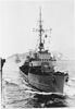 Minensuchboote bei der Arbeit. Ein Minensuch-Verband verlässt in Kriegsmarsch-Formationen einen Stützpunkt, um den Kampf gegen den unsichtbaren Feind, der Mine aufzunehmen.