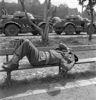 Vóór de parade. Deze foto maakt onderdeel uit van de collectie van Emmy Andriesse (1914-1953), een van de meest gerenommeerde fotografen van Nederland. Na afronding van haar studie verhuisde zij naar Amsterdam, waar ze ging werken als fotograaf. Andriesse leverde veel foto's aan kranten en tijdschriften die zich kenmerkten door het gebruik van verrassende camerastandpunten en voorliefde voor diagonale beeldopbouw. De onderwerpen waren ambachten, landschappen en het leven van volwassenen en kinderen in steden en dorpen. Dit kon zij doen tot het zogenaamde ‘Journalistenbesluit’ van de Duitse bezetter in 1941. Als Jodin kon zij niet werken of publiceren en moest onderduiken. Eind 1944 regelde de bevriende antropoloog Arie de Froe een vervalste ariërverklaring voor haar en kon zij weer aan het publieke leven deelnemen. Ze sloot zich aan bij het illegale fotografencollectief ‘De Ondergedoken Camera’. De foto's die Andriesse onder moeilijke omstandigheden maakte van de Hongerwinter in Amsterdam, behoren tot de meest indringende uit haar oeuvre.