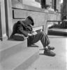 Man op stoep. Deze foto maakt onderdeel uit van de collectie van Emmy Andriesse (1914-1953), een van de meest gerenommeerde fotografen van Nederland. Na afronding van haar studie verhuisde zij naar Amsterdam, waar ze ging werken als fotograaf. Andriesse leverde veel foto's aan kranten en tijdschriften die zich kenmerkten door het gebruik van verrassende camerastandpunten en voorliefde voor diagonale beeldopbouw. De onderwerpen waren ambachten, landschappen en het leven van volwassenen en kinderen in steden en dorpen. Dit kon zij doen tot het zogenaamde ‘Journalistenbesluit’ van de Duitse bezetter in 1941. Als Jodin kon zij niet werken of publiceren en moest onderduiken. Eind 1944 regelde de bevriende antropoloog Arie de Froe een vervalste ariërverklaring voor haar en kon zij weer aan het publieke leven deelnemen. Ze sloot zich aan bij het illegale fotografencollectief ‘De Ondergedoken Camera’. De foto's die Andriesse onder moeilijke omstandigheden maakte van de Hongerwinter in Amsterdam, behoren tot de meest indringende uit haar oeuvre.