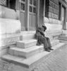 Man op stoep. Deze foto maakt onderdeel uit van de collectie van Emmy Andriesse (1914-1953), een van de meest gerenommeerde fotografen van Nederland. Na afronding van haar studie verhuisde zij naar Amsterdam, waar ze ging werken als fotograaf. Andriesse leverde veel foto's aan kranten en tijdschriften die zich kenmerkten door het gebruik van verrassende camerastandpunten en voorliefde voor diagonale beeldopbouw. De onderwerpen waren ambachten, landschappen en het leven van volwassenen en kinderen in steden en dorpen. Dit kon zij doen tot het zogenaamde ‘Journalistenbesluit’ van de Duitse bezetter in 1941. Als Jodin kon zij niet werken of publiceren en moest onderduiken. Eind 1944 regelde de bevriende antropoloog Arie de Froe een vervalste ariërverklaring voor haar en kon zij weer aan het publieke leven deelnemen. Ze sloot zich aan bij het illegale fotografencollectief ‘De Ondergedoken Camera’. De foto's die Andriesse onder moeilijke omstandigheden maakte van de Hongerwinter in Amsterdam, behoren tot de meest indringende uit haar oeuvre.